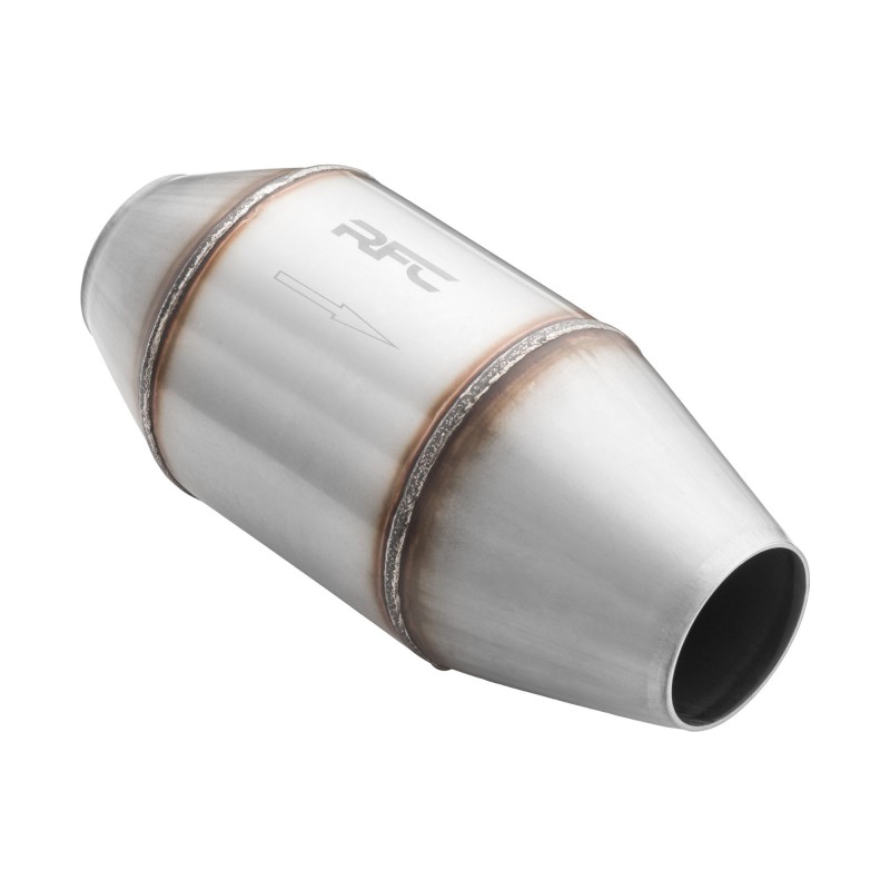 Catalizzatore sportivo in acciaio inox S409 con inserto metallico tipo S a 3 anime per aumentare le prestazioni e la durata. Compatibile con motori a benzina, diesel e GPL. Montato in parallelo, supporta cilindrate fino a 10 litri. Il cono su un lato è stato accorciato, consentendo il montaggio del catalizzatore su auto con spazio limitato.
